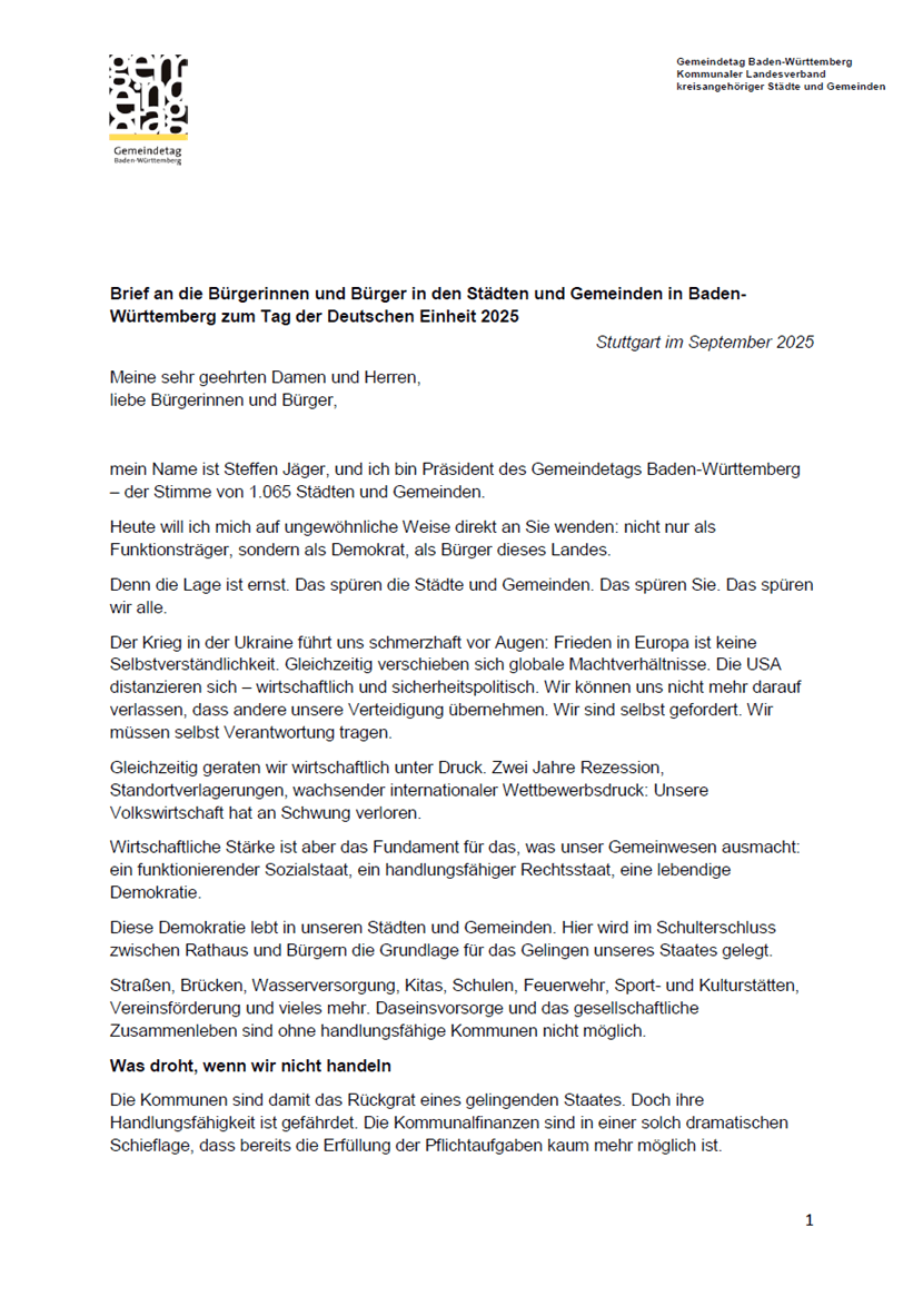 der Präsident des Gemeindetags, Steffen Jäger, hat als Stimme der Städte und Gemeinden in Baden-Württemberg einen eindringlichen Appell zur Lage unseres Landes und zur Rolle der Kommunen veröffentlicht. Auch wir in Dettingen spüren Tag für Tag, was auf dem Spiel steht. Dies wird in allen Bereichen in unserer Gemeinde deutlich.