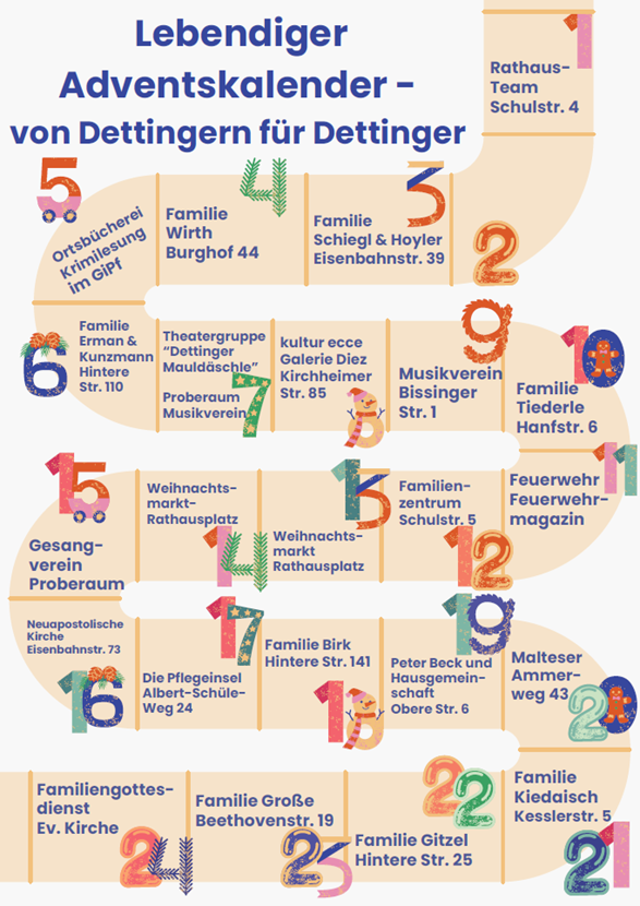 Ab kommenden Montag erwartet Sie ab 17.00 Uhr das erste Kalendertürchen. Das erste Türchen öffnet sich mit dem Rathaus-Team am Rathaus mit Waffeln und einer Geschichte. Seien Sie Gast in den nächsten Tagen bei Dettinger Familien, Einrichtungen und Vereinen. Haben Sie gemeinsam eine besinnliche Vorweihnachtszeit und genießen Sie das Zusammensein.